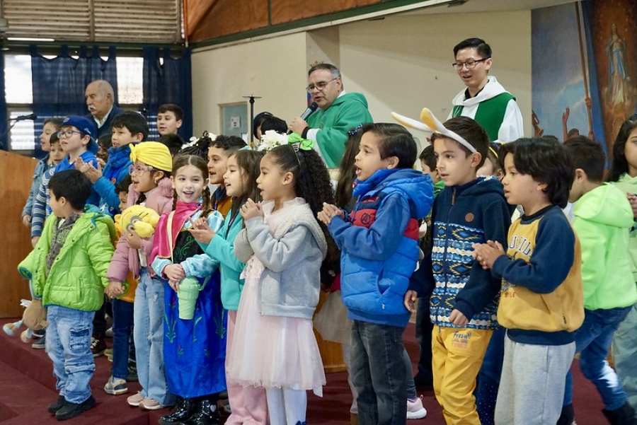 Santiago, 11 de agosto de 2025.– La comunidad educativa del Colegio Salesiano Oratorio Don Bosco vivió este domingo 10 de agosto una eucaristía dominical marcada por la masiva asistencia de familias, algunas de ellas acompañadas incluso por sus mascotas. La gran convocatoria llevó a trasladar la ceremonia desde su ubicación habitual hasta el Salón Don Bosco, el cual se llenó por completo, desbordando entusiasmo y reflejando en cada rincón los colores característicos de esta Semana Salesiana: rojo, verde, azul y amarillo.